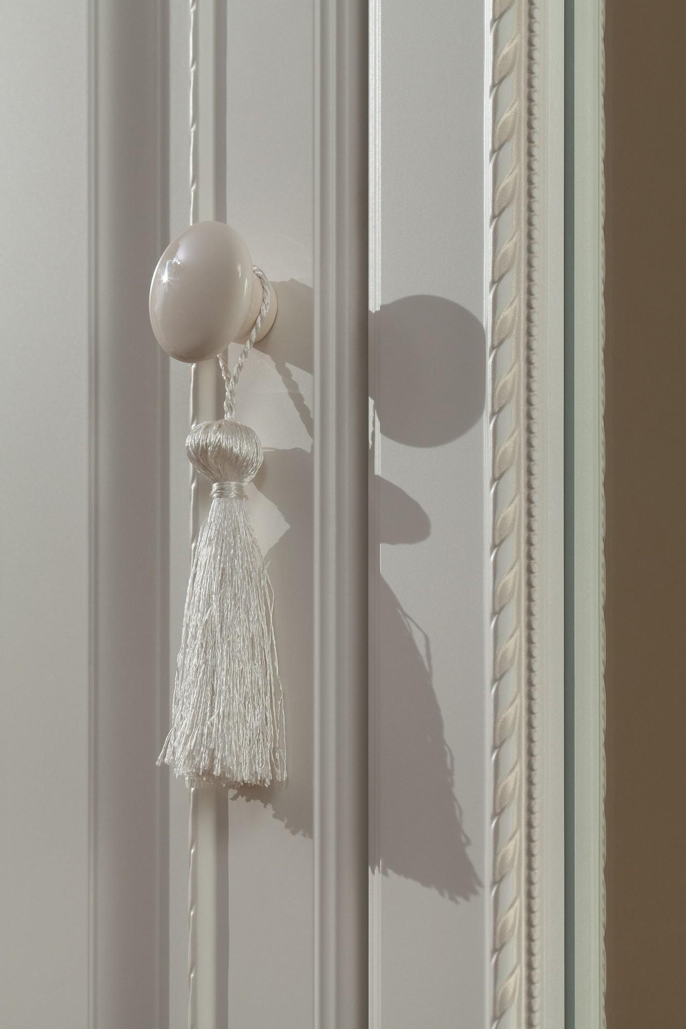 Фасады шкафа выполнены в нежном оттенке джелато, дверцы украшены фрезеровкой, а ручки - декоративными кистями.