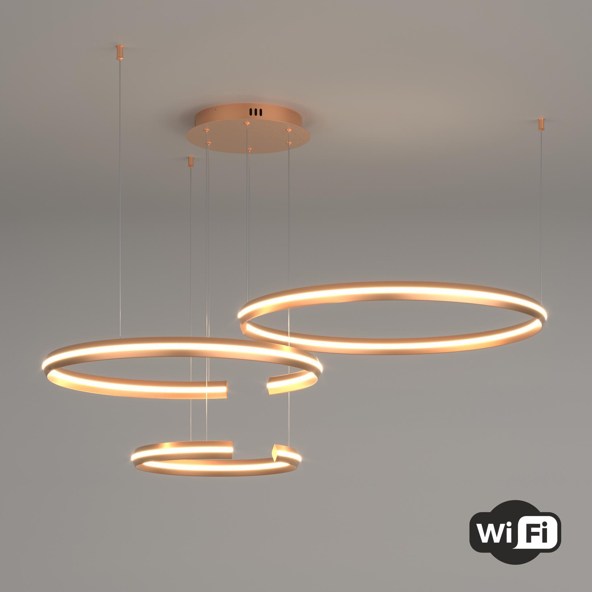 Подвесной светодиодный светильник с ПДУ и управлением по Wi-Fi 90280/3 в золотом цвете поможет организовать качественное освещение на площади 44 м кв. и украсить современный интерьер. Высокотехнологичный светильник оснащен экономичными SMD светодиодами мощностью 160 Вт, создающие световой поток 8000 лм. В производстве подвесной LED люстры использовали высококачественный металл с надежным защитным покрытием. Подвесная светодиодная люстра подходит для установки на любые поверхности, в том числе монтируется в натяжные и подвесные потолки. Наш интернет-магазин предлагает купить подвесной светодиодный светильник с управлением по Wi-Fi по низкой цене с доставкой по России.
