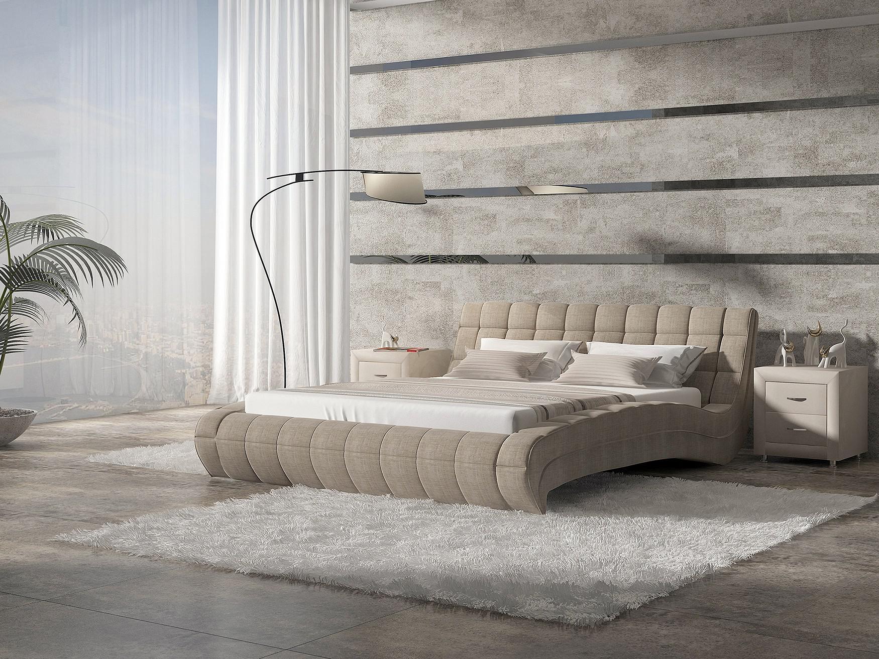 Изящная и элегантная интерьерная кровать с изысканным внешний видом и плавными линиями. В комплект кровати входит кроватное основание. Каркас основания выполнен из металла, ламели - из берёзы. Обратная сторона изголовья также обита основным материалом.