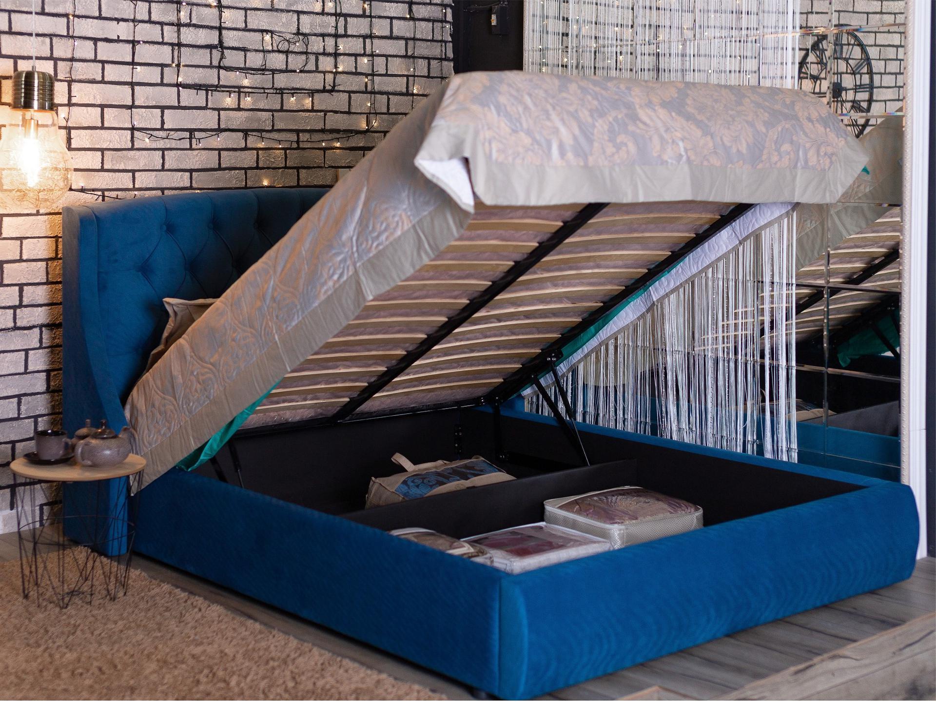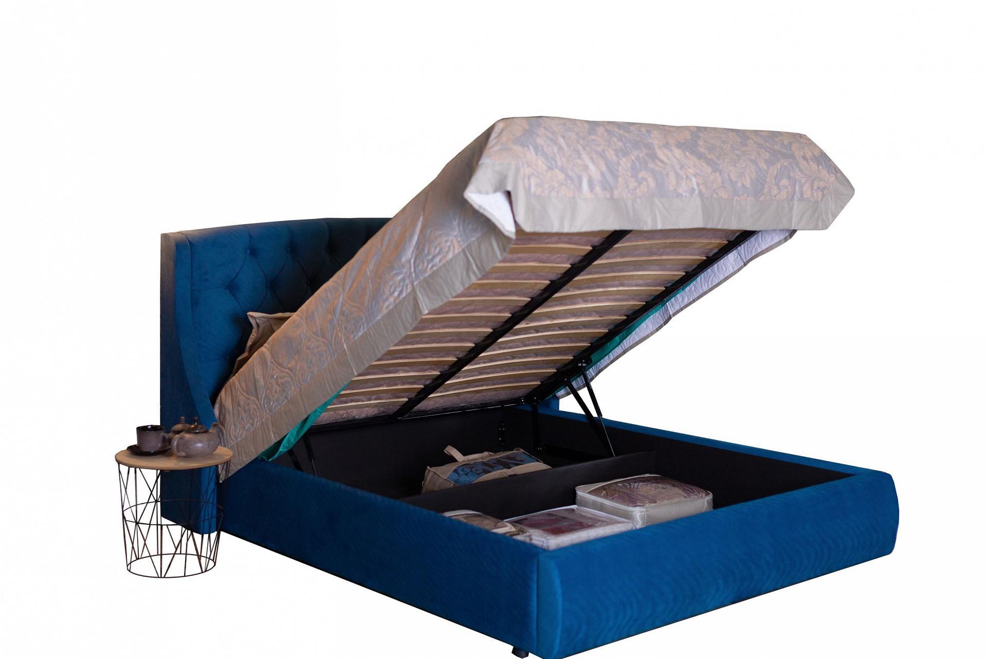 Ценители прекрасного поистине оценят мягкую интерьерную кровать Stefani из ткани с подъемным механизмом и высоким изголовьем.
