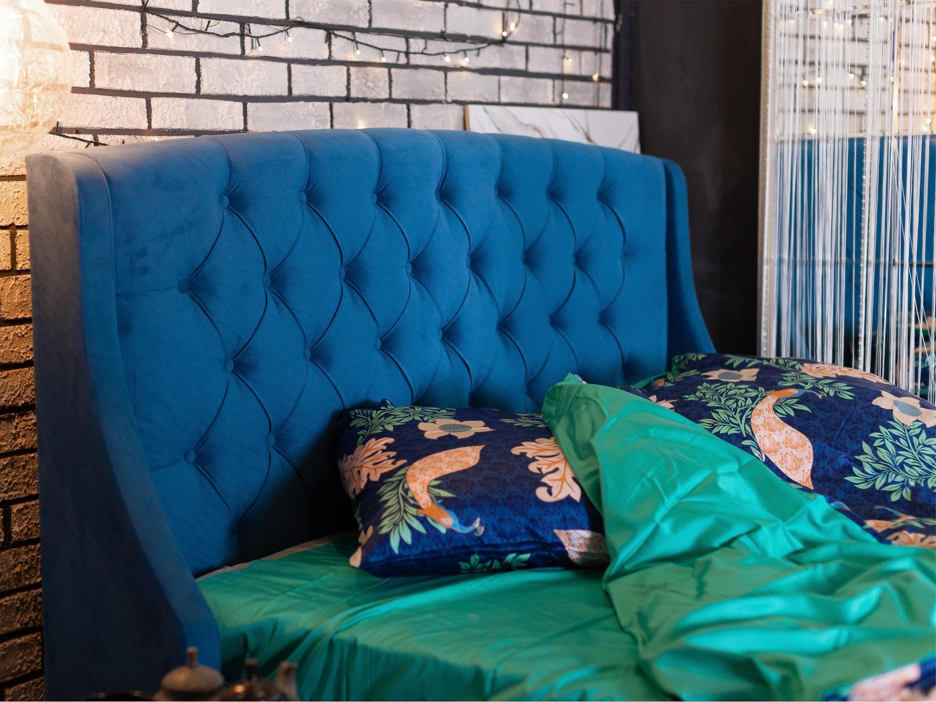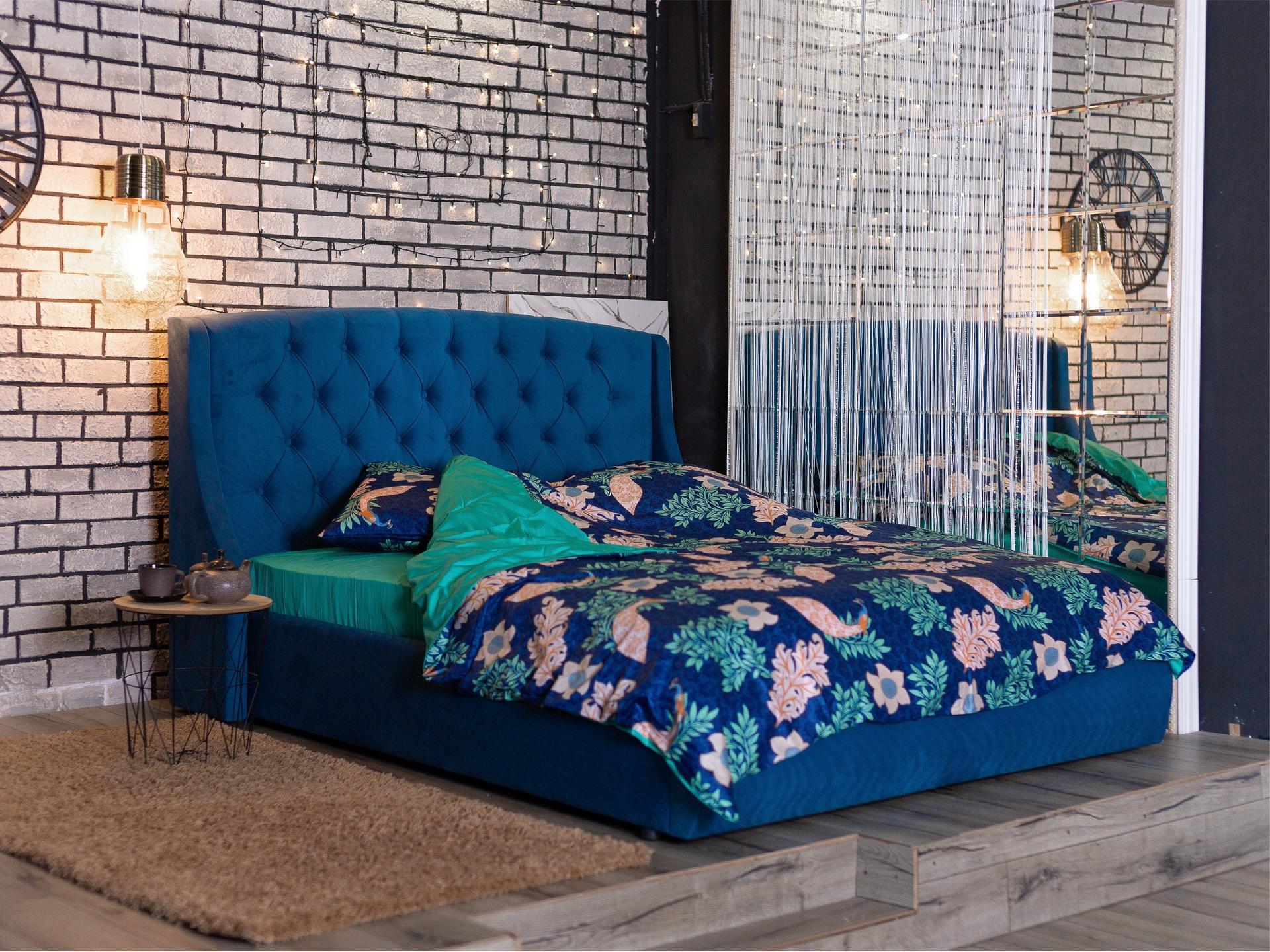 Основной акцент сделан на высоком изголовье с мягкими боковинами – “ушками”. Мягкая спинка изящно оформлены каретной стяжкой с декоративными пуговицами в тон изголовья.
