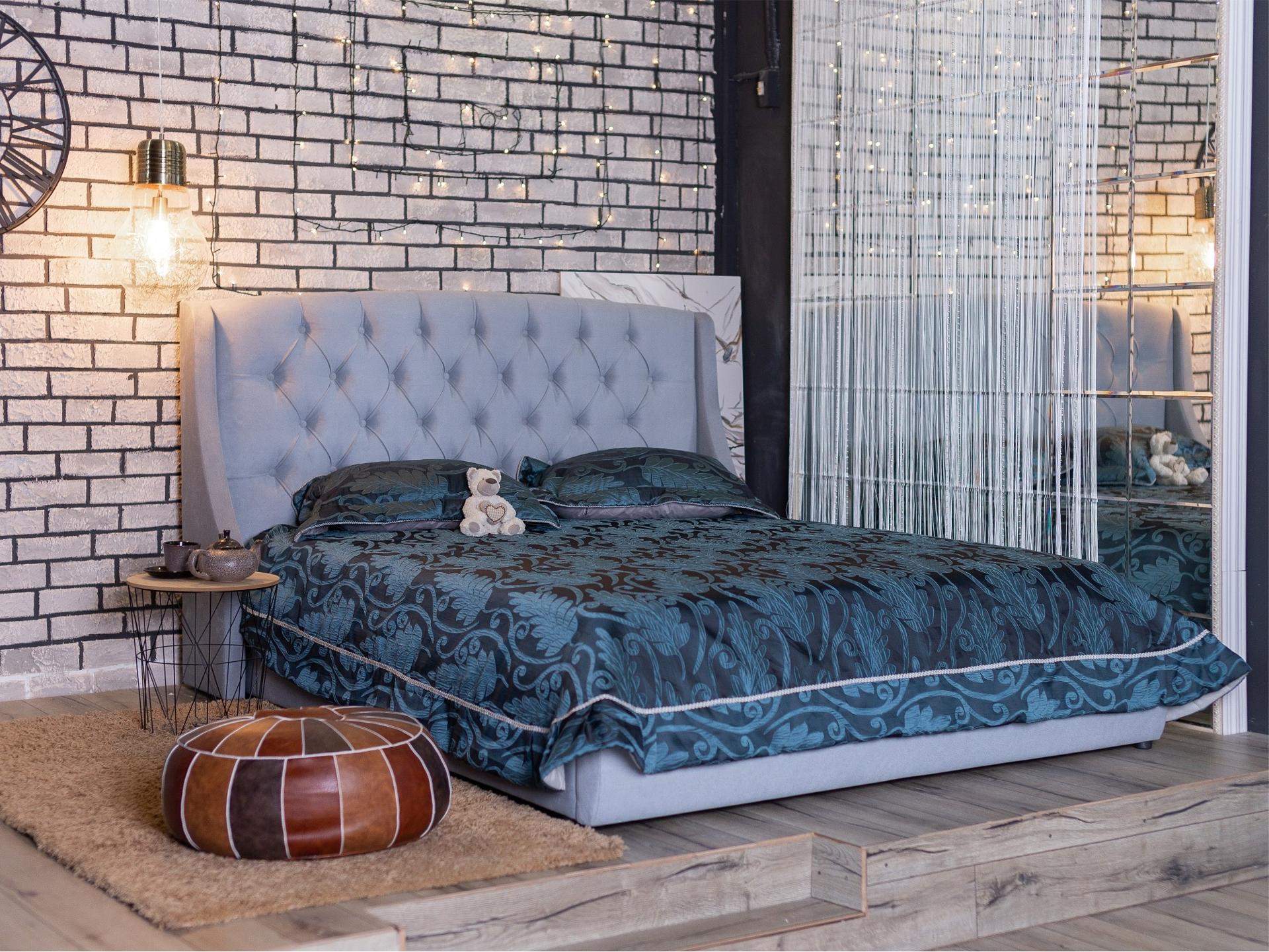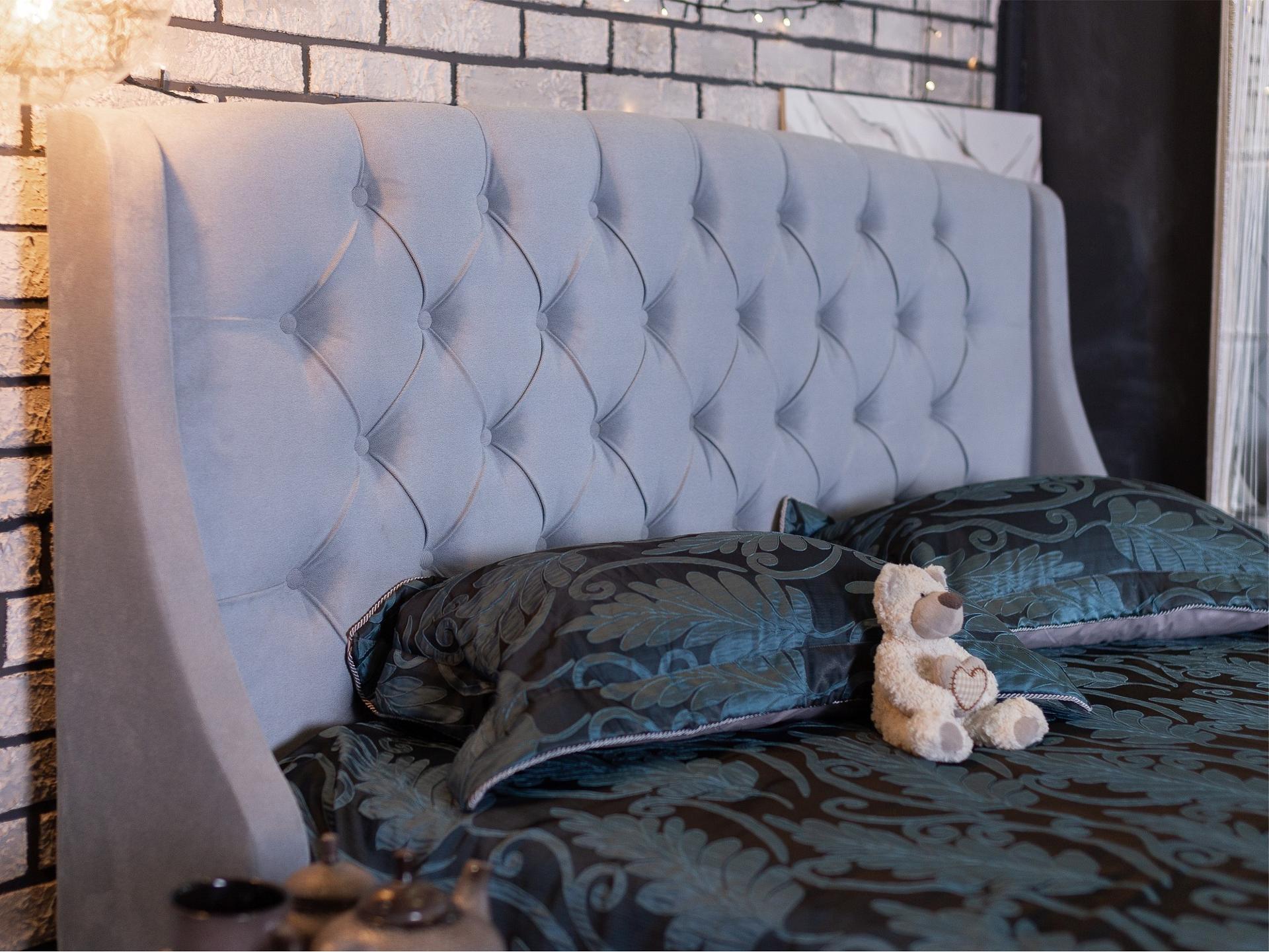 Основной акцент сделан на высоком изголовье с мягкими боковинами – “ушками”. Мягкая спинка изящно оформлены каретной стяжкой с декоративными пуговицами в тон изголовья.