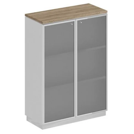 Тумба состоит из стеллажа, топа, цоколя и стеклянных дверей в алюминиевой рамке.