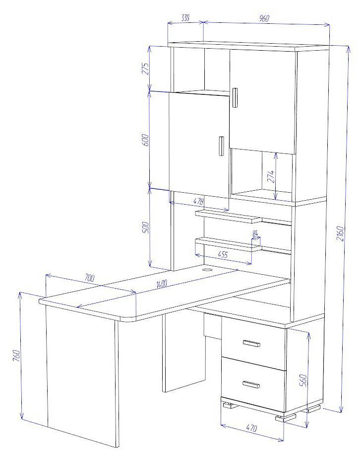 стеллаж:2 дверцы,2 ящика,5 полок
