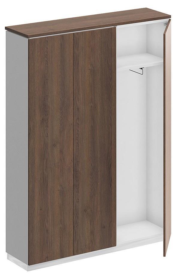 Шкаф состоит из шкафа для документов, узкого шкафа для одежды под общим топом и цоколя на 2 шкафа.