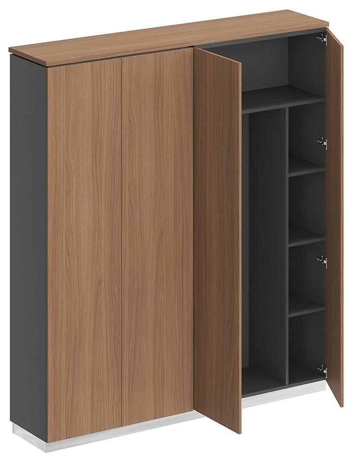 Шкаф состоит из закрытого шкафа для документов и шкафа для одежды с дополнением под общим топом под общим топом и цоколя на 2 шкафа.