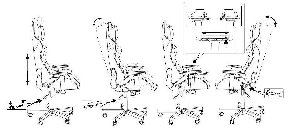Механизм качания с регулировкой под вес и возможностью фиксации в вертикальном положении. Регулировка высоты (газлифт). Регулировка угла наклона спинки (реклайнер 90-150 градусов). Поддержка шеи и поясницы (2 эргономичные подушки). Подлокотники пластиковые 3D. Каркас стальной. Крестовина металлическая разборная. Колеса для паркета и ламината.