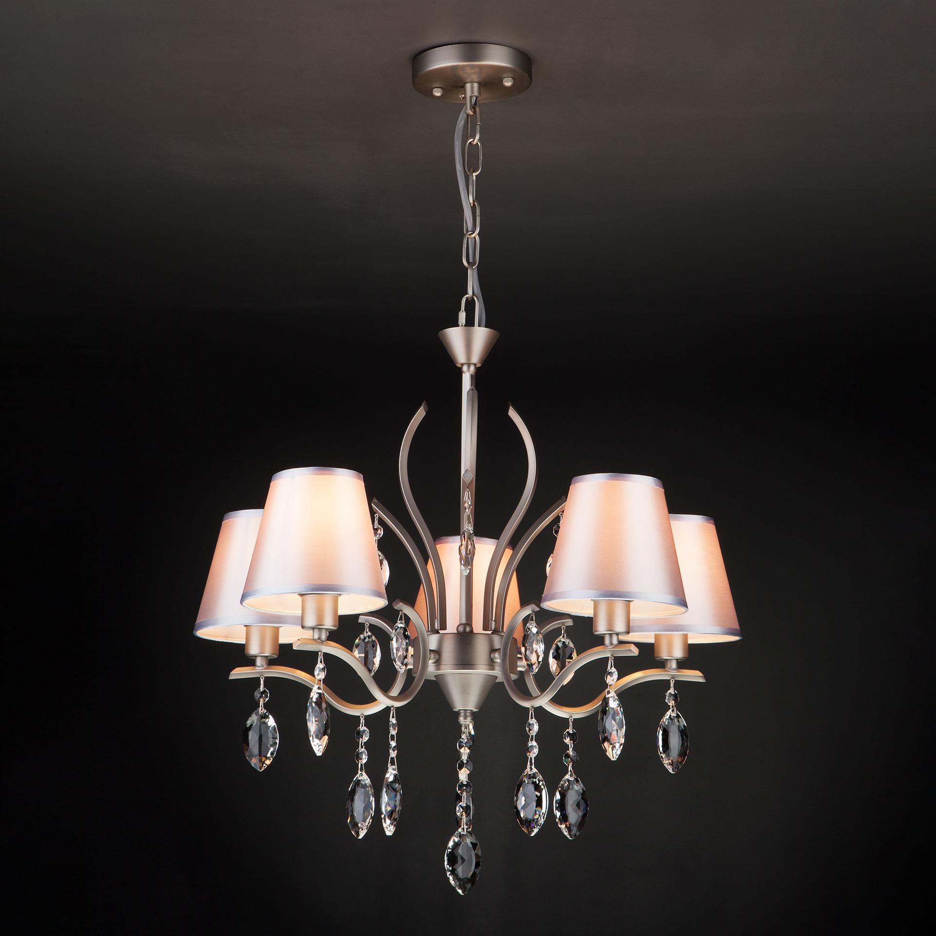Подвесная люстра с хрусталем 10089/5 сатин-никель/прозрачный хрусталь Strotskis предназначена для создания основного освещения в современных и классических интерьерах, подходит для различных типов помещений: гостиная, спальня и рассчитана на площадь освещения 16м². Роскошная люстра оснащена патронами с цоколем Е14, которые рассчитаны на максимальную мощность ламп 40 Вт. Люстра украшена эффектным декором из хрусталя и дополнена выразительными тканевыми абажурами. Арматура изготовлена из высококачественного металла с надежным защитным покрытием. Дизайн серии «Aurelia» продуман до мелочей: серебряные абажуры идеально сочетаются с основанием цвета сатин-никель, а хрустальные подвески делают образ целостным и гармоничным. В нашем интернет-магазине вы можете купить подвесную люстру по выгодной цене.