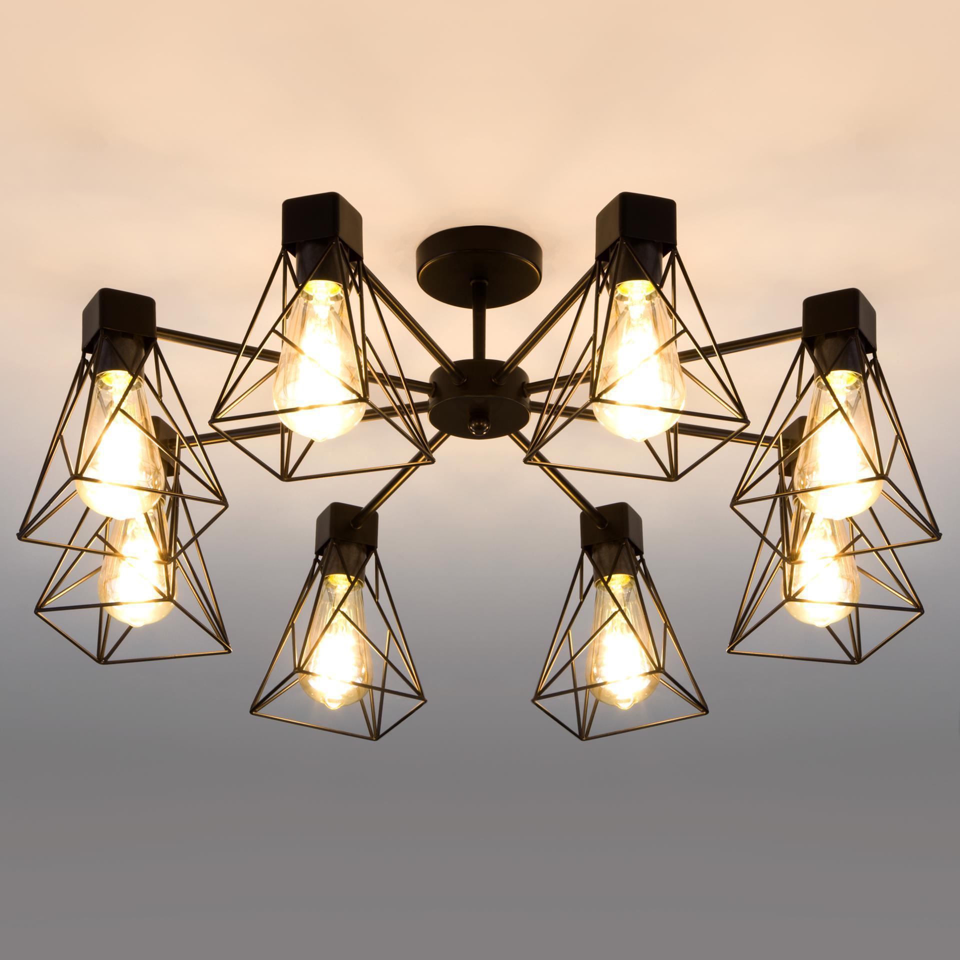 Украсить ваше потолочное пространство и создать качественное освещение на площади 36 м кв. поможет стильная люстра в стиле loft. Строгий внешний вид и конструктивная простота форм добавят в современный интерьер индустриального стиля, а гармоничный цветовой тандем из черного цвета и ламп теплого свечения подчеркнут его. В восьмирожковой люстре используются сменные лампы с цоколем E27, рассчитанные на максимальную мощность 60 Вт. Потолочный светильник оснащен металлическими плафонами. В производстве люстры использован высококачественный металл с надежным защитным покрытием. В интернет-магазине Минимир вы сможете купить потолочную люстру с доставкой по Москве, Санкт-Петербургу и России.