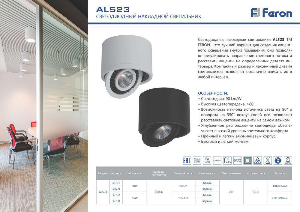 Светильник накладной светодиодный для акцентного освещения, спот поворотный (ДПО) FERON AL523, 15W, (белый), 230V, 1350Lm, IP20, угол рассеивания 24°, цвет белый, корпус алюминий, рассеиватель поликарбонат, 112*112*90